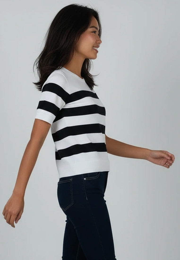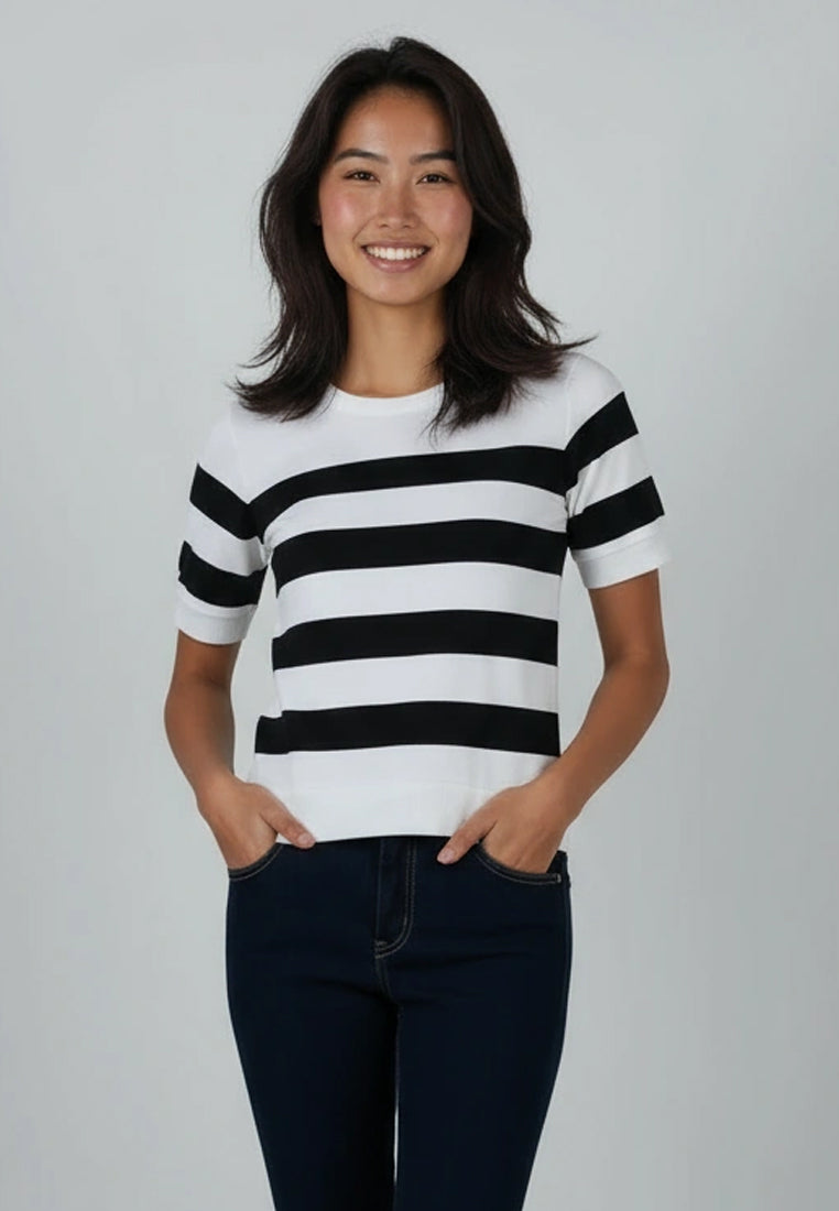A modern take on the timeless stripe. The Illaine Top brings effortless sophistication with its bold black-and-white pattern and soft French terry texture. Designed to strike the perfect balance between comfort and structure, it feels cozy yet refined—ideal for days when you want to look polished without trying too hard.