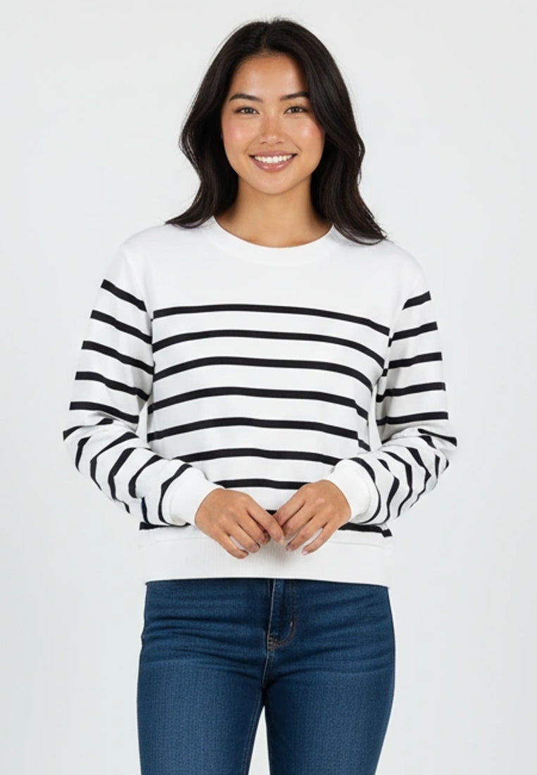 Stripes, redefined. The Imeele Pullover gives a fresh twist to a timeless look with its clean black base and crisp white lines. Crafted from premium French terry, it offers a soft, mid-weight feel that keeps you comfortable through cool mornings and cozy evenings. The ribbed cuffs and hem add a refined finish, making it easy to pair with jeans or tailored pants for an effortlessly elevated outfit.