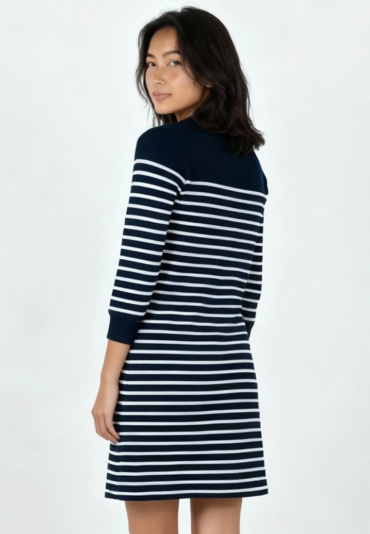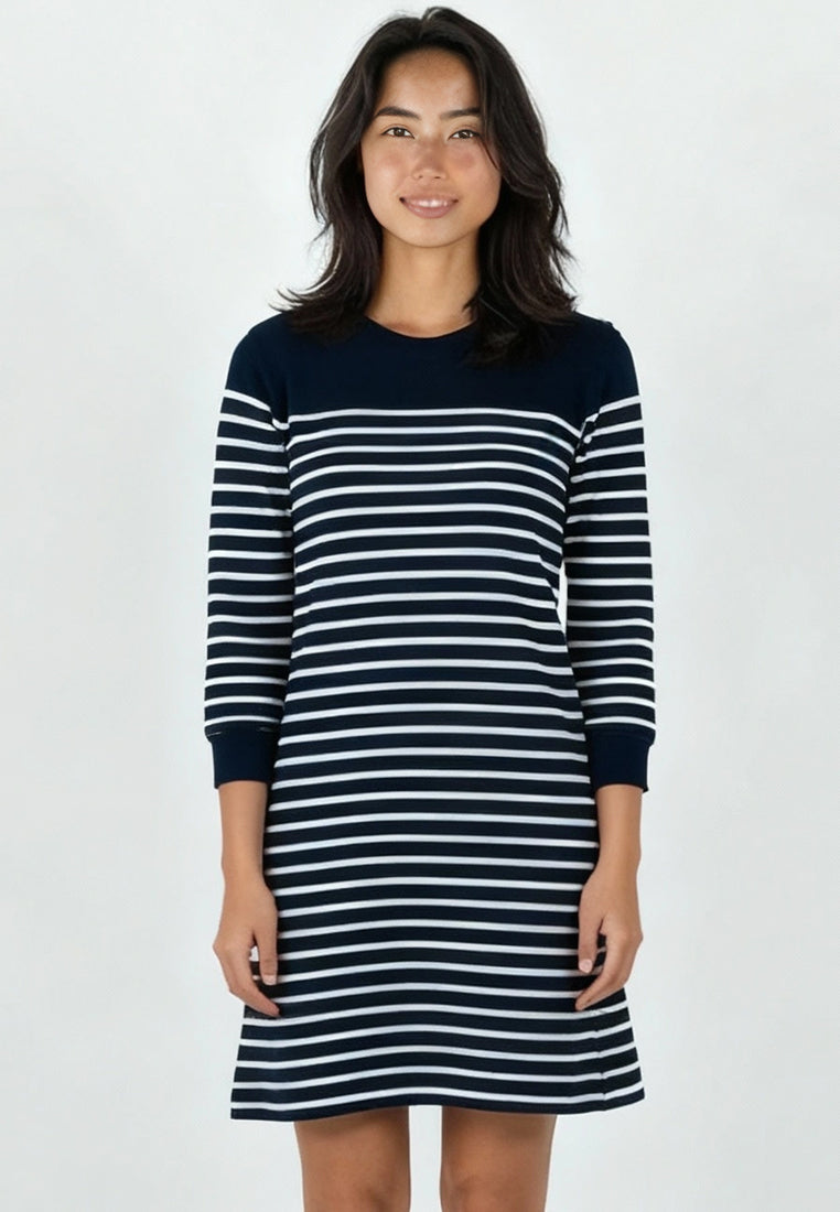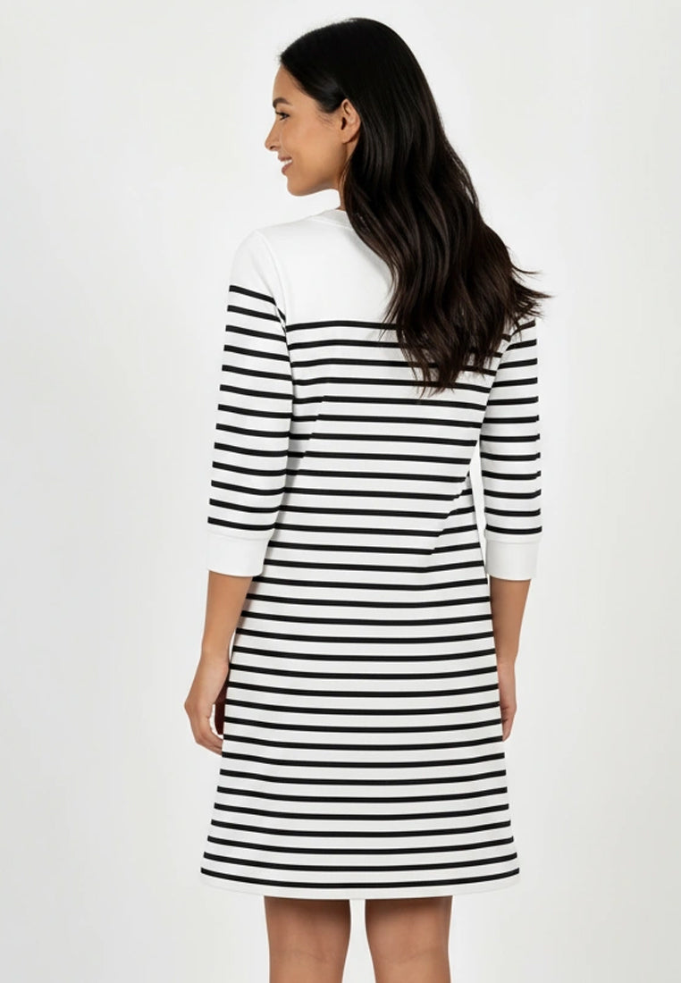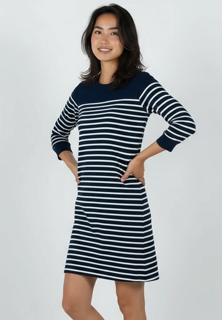 A fresh approach to the classic stripe. The Mozella Dress pairs easy comfort with effortless polish, designed in premium French terry for a structured yet soft feel. Its clean crew neckline and three-quarter sleeves add a touch of sophistication, while the above-the-knee cut keeps the look relaxed and versatile. Perfect for days when you want to move freely but still look put-together.