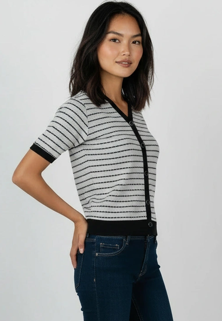 The contrast trims, V-neckline, and full button-down front give it a polished, modern finish, making it an effortless choice for everyday wear. Soft yet structured, this piece balances coziness with a clean, put-together appeal.
